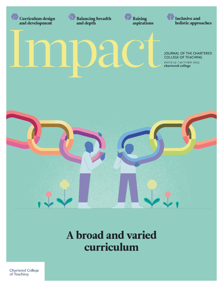 Impact is the termly journal of the Chartered College. It connects research findings to classroom practice, with a focus on the interests and voices of teachers and educators. It supports the teaching community by promoting discussion around evidence within the classroom, and enabling teachers to share and reflect on their own use of research.
