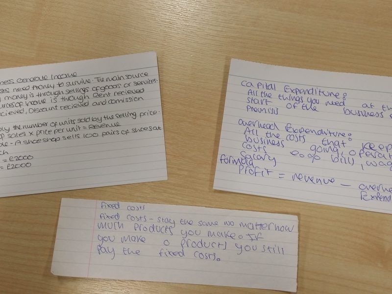 Following each Business Studies lesson where new learning was taught, the pupils’ homework was to produce a single revision card with key learning points on it. They built up revision cards over time, using personal memory cues that best help them to remember key information.